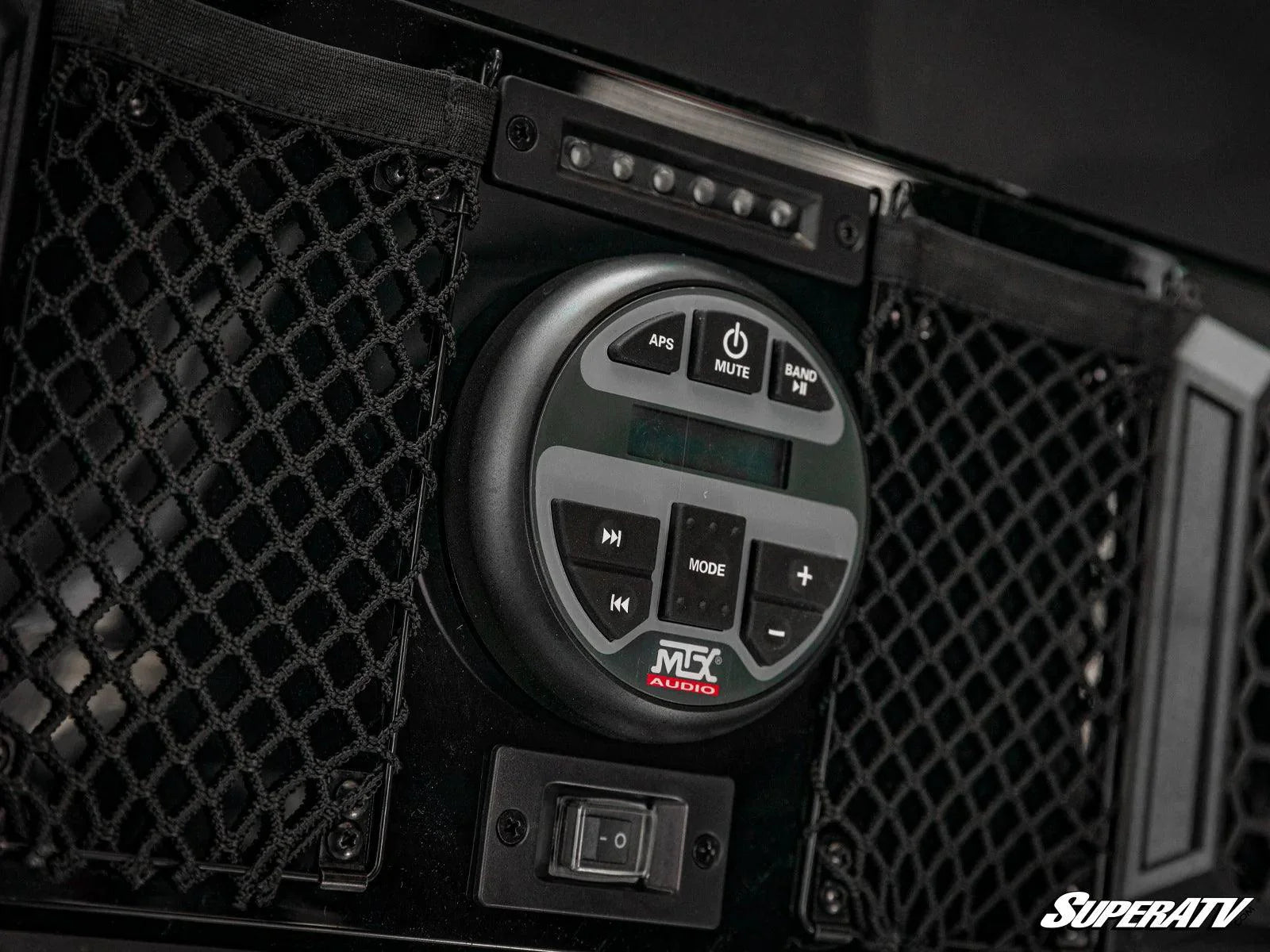 On top of killer sound, this UTV sound system packs in the perks. There’s a bright LED dome light in the center so you can check your map or see where you dropped your phone after the sun goes down. We doubt you’ll be dropping anything though, thanks to the built-in overhead cargo nets. This system even has an AM/FM radio for when you don’t have cell service.