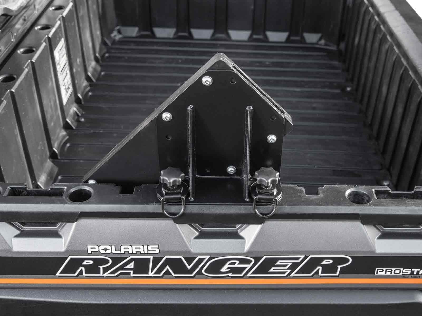 This Polaris Ranger chainsaw mount is made from durable UHMW. It can be installed either inside or outside of your bed, which gives you more control over your cargo space. It secures to your bed rails using our upgraded aluminum Latch and Go Tie Downs that have 6061 billet aluminum lockers with a knurled finish for a more secure fit. With your chainsaw secured and your cargo protected, you’ll be ready to tackle any job.