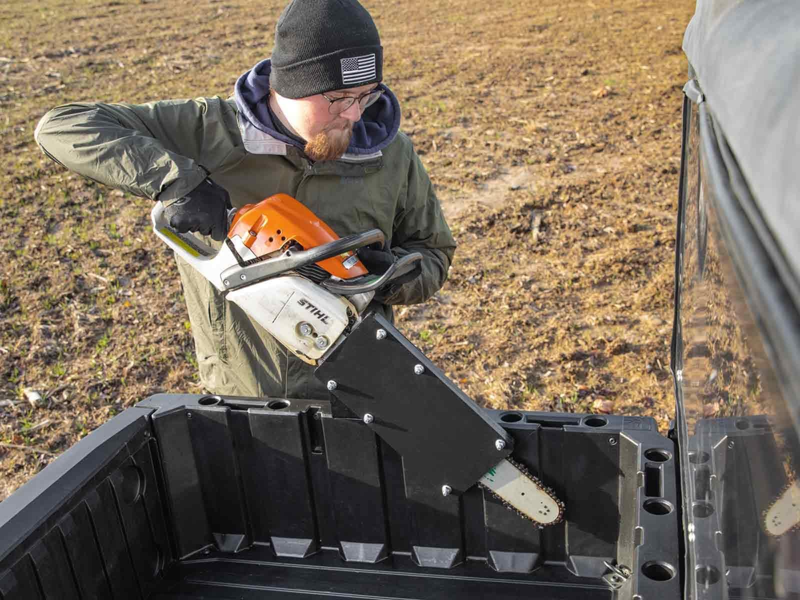 Why do you need a Ranger chainsaw mount? For starters, it protects your saw blade so it doesn’t get banged up, which makes your tool last longer. Having a secure spot to keep your chainsaw also keeps your bed from getting scratched up by the blade. And keeping it up and out of the way frees up your cargo area for other stuff, like a toolbox or cooler.