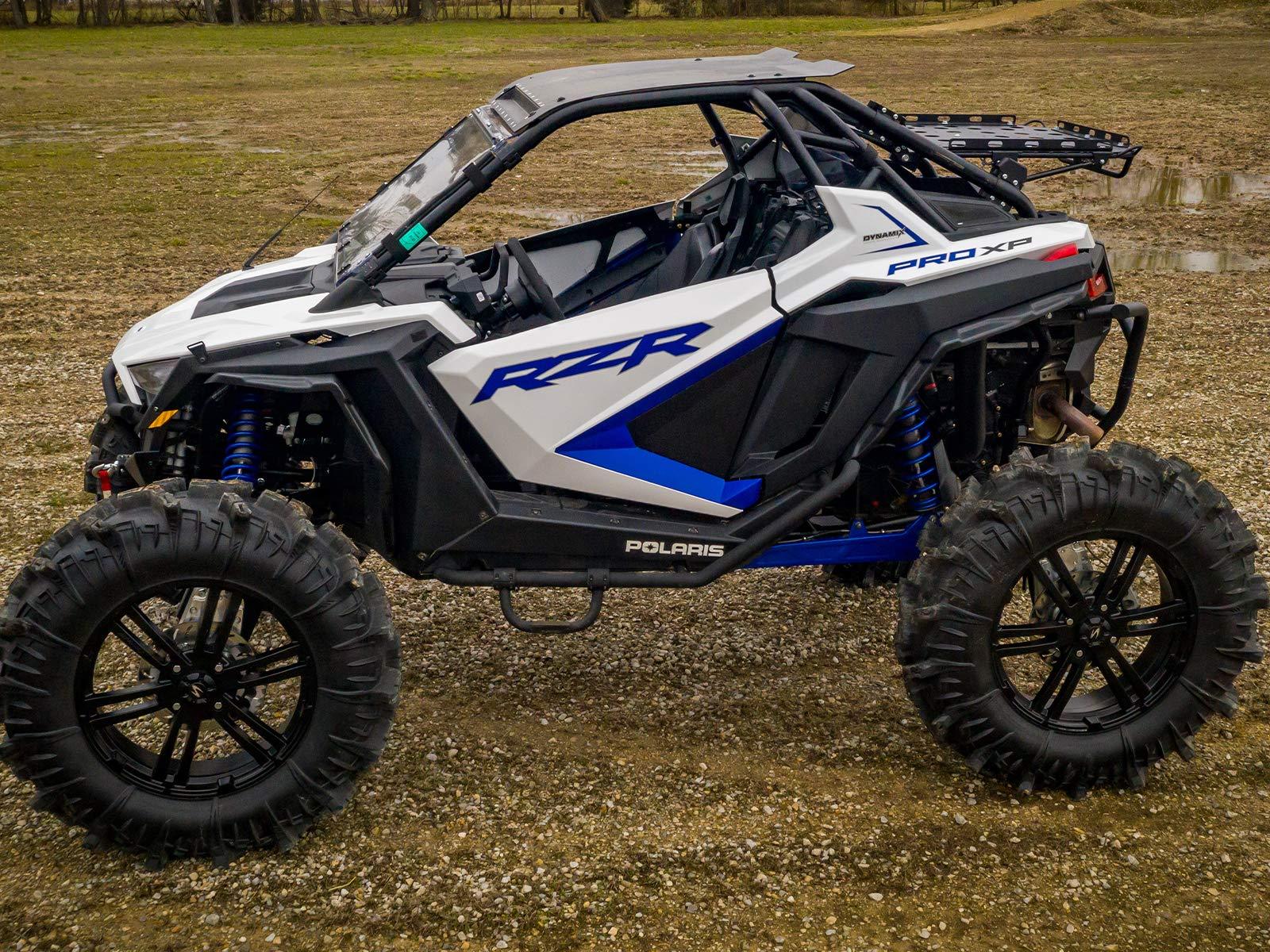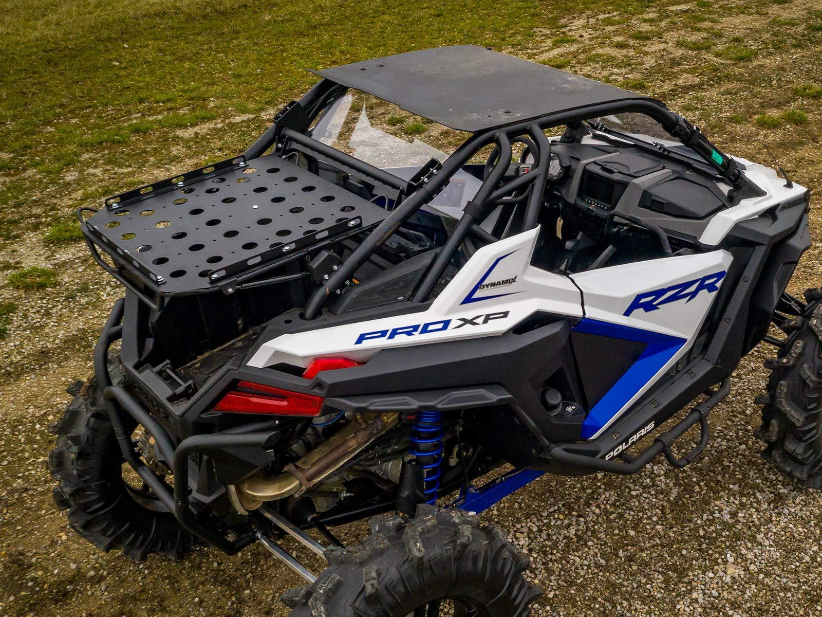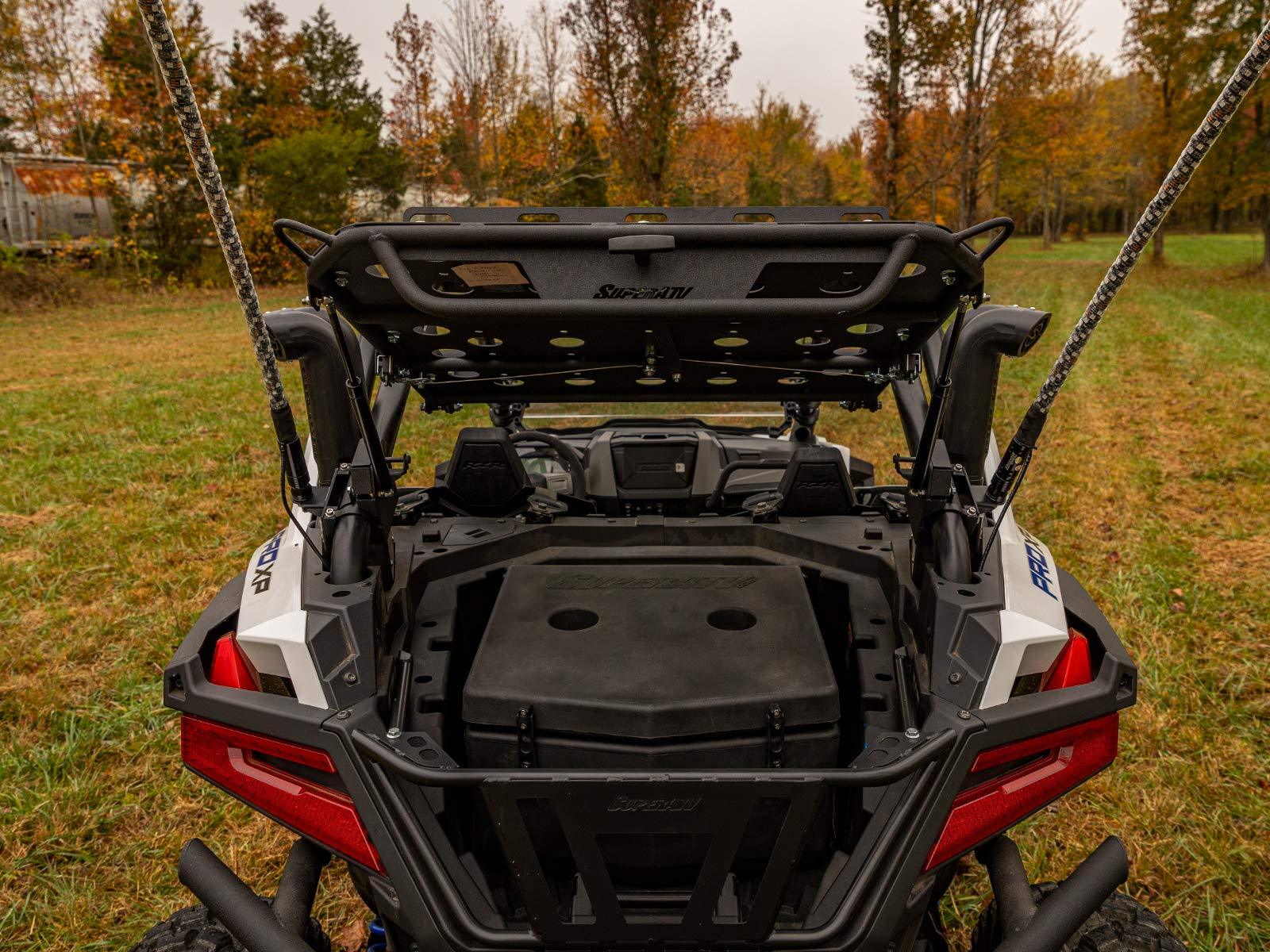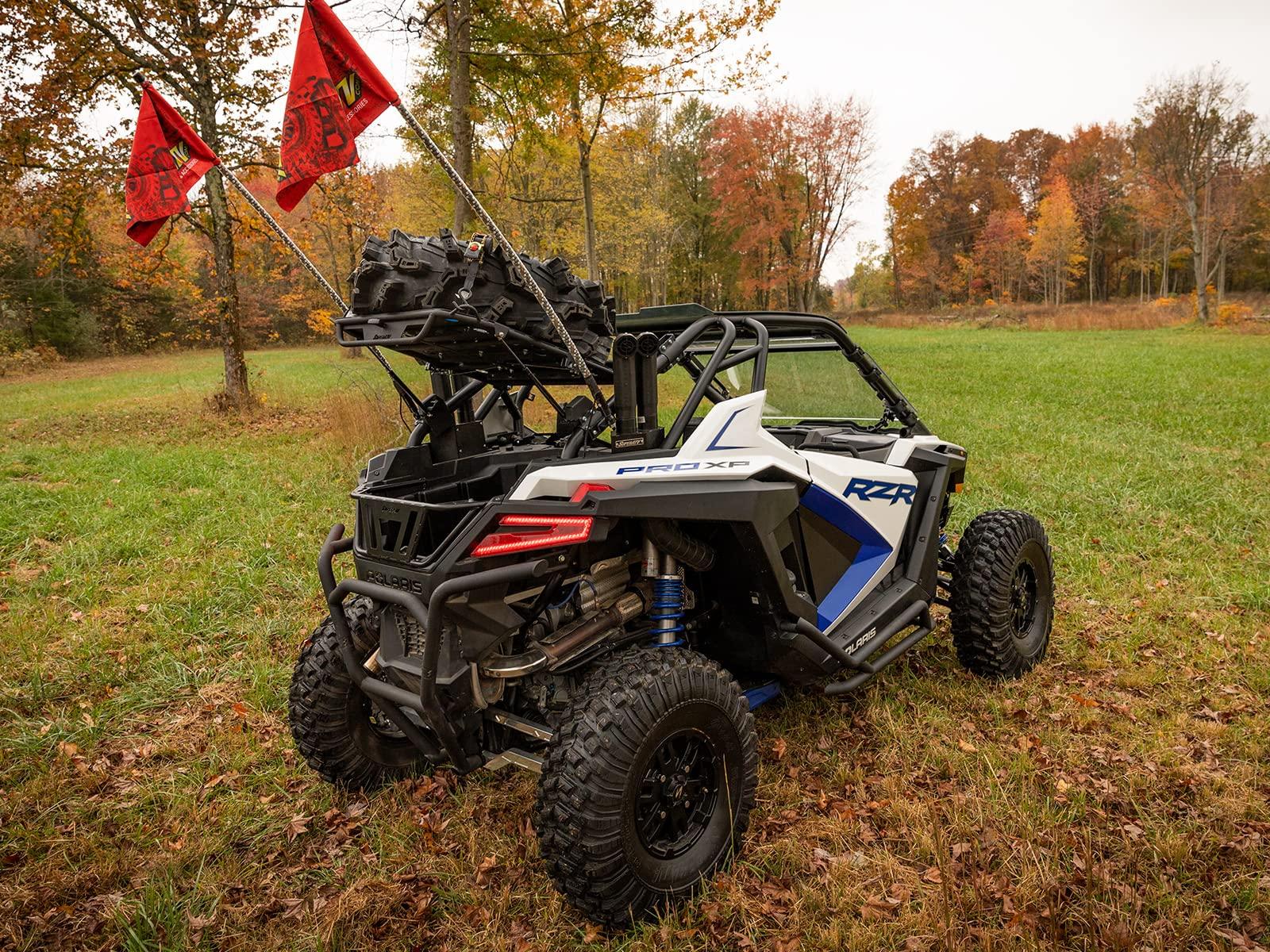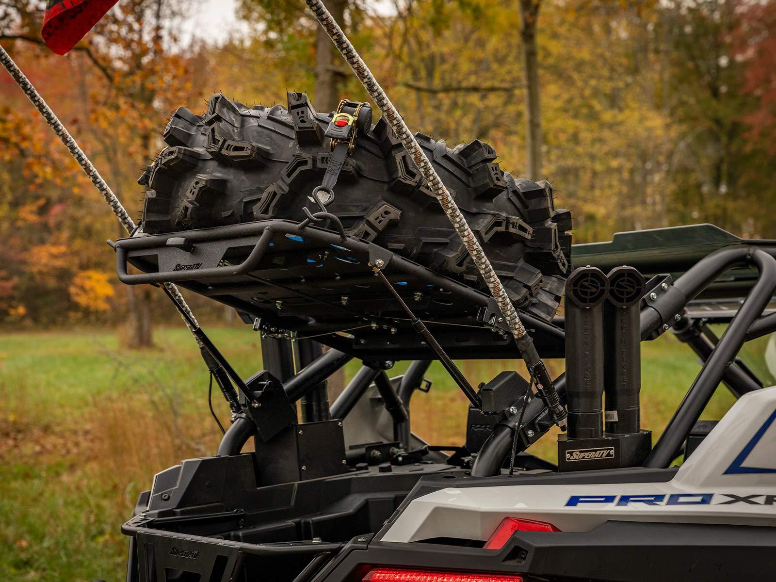 Here at SuperATV, we’re all about smart storage solutions designed to make your ride better and your life easier. Exhibit A is the Cargo Rack Alpha for the Polaris RZR PRO XP. It attaches to your frame using heavy-duty clamps and, unlike other UTV cargo racks, it’s not stationary once installed. This rack utilizes gas struts that let you raise and lower it with the turn of a handle so no matter what you’re hauling—even something as big as a spare tire—you’ve got easy access to the bed below.