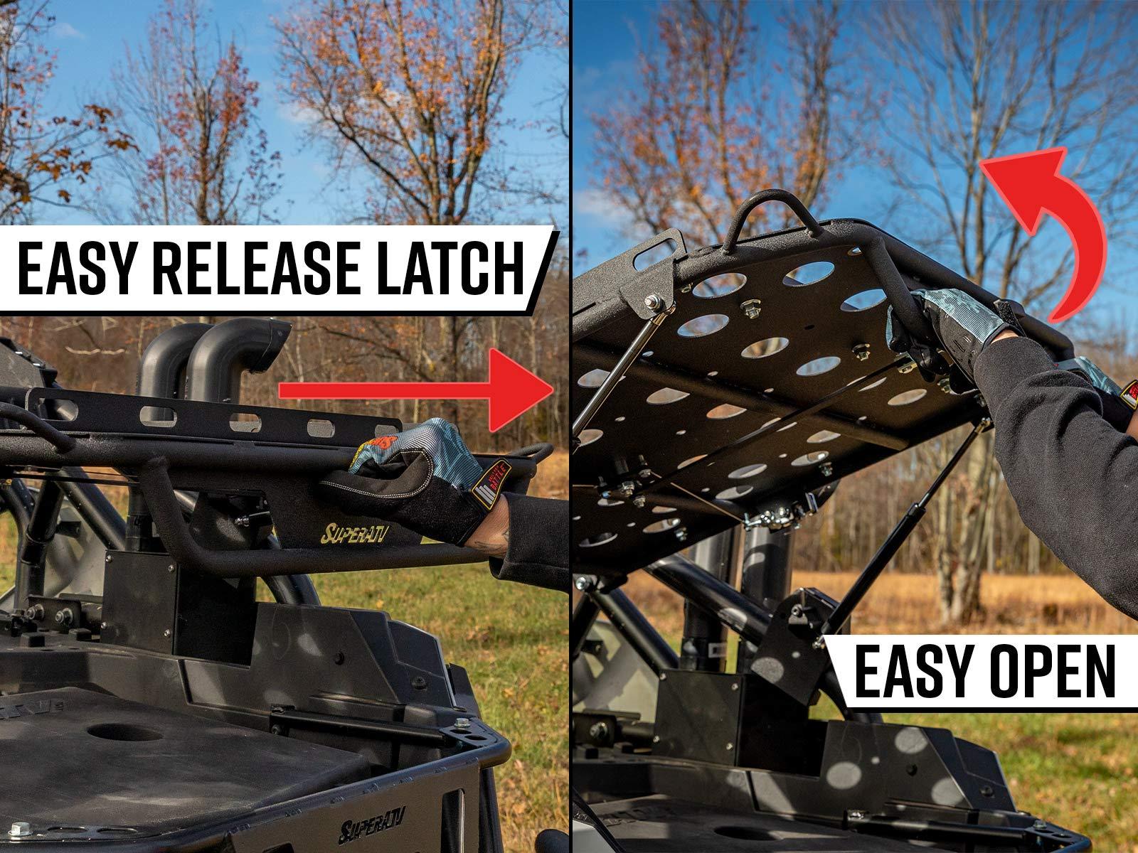 This easy-to-use storage system maximizes your PRO XP’s existing storage space. The platform mounts above the cargo area and gives you somewhere to tie down a cooler. It also acts as a spare tire carrier! Ball-studded gas struts let you raise and lower the platform to access the bed below. Got your hands full? No problem—raising it is as simple as turning a lever and can be done with one hand, even with a tire on top. The rack locks into place as soon as you close it, so there’s no need to mess with any pins or latches.
